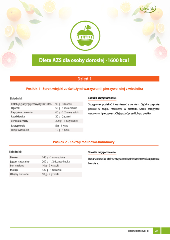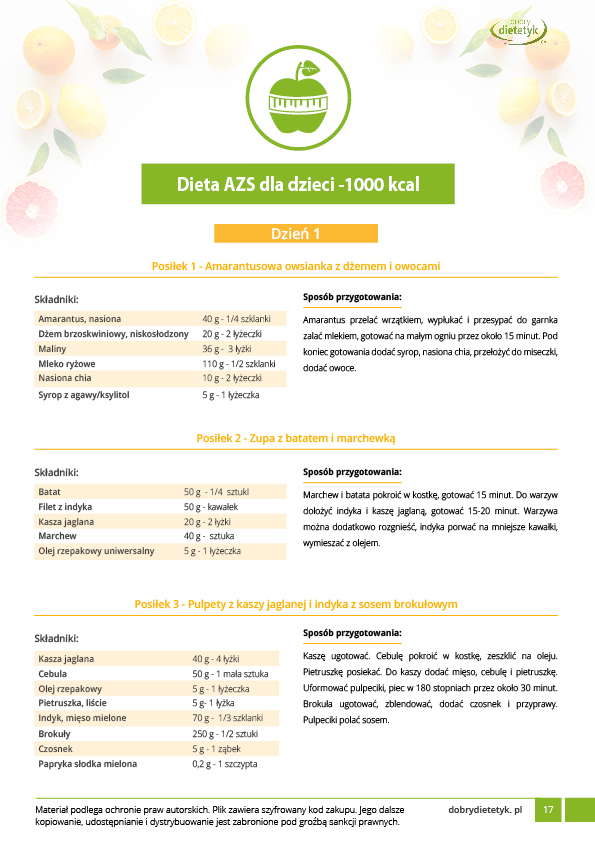 Opracowanie zawiera zbiór niezwykle ważnych informacji dla osób borykających się z atopowym zapaleniem skóry. Dodatkowo przygotowano dwa 7-dniowe jadłospisy dla dzieci i osób dorosłych. Program dietetyczny został opracowany przez zespół dietetyków specjalizujących się w leczeniu żywieniowym chorób skóry. W diecie zadbano o najważniejsze potrzeby żywieniowe z jednoczesnym ograniczeniem produktów  zaostrzających AZS.