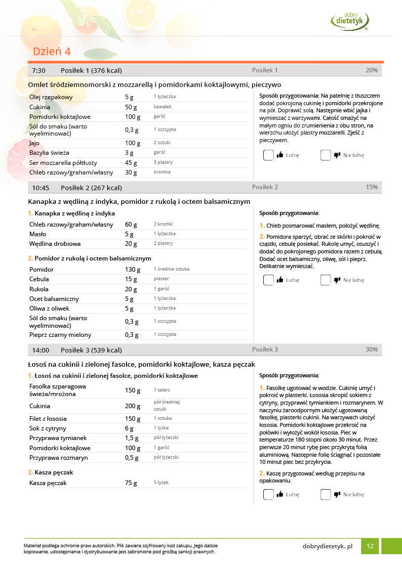 w formie propozycji posiłków (zamiast pojedynczych jadłospisów jednodniowych, przygotowano propozycje kilku propozycji dań na każdy posiłek). Tutaj nie uzależniamy Cię od tego jakie masz np. w danym dniu zjeść śniadanie czy obiad, tylko sam wybierasz sobie ulubione danie z kilku przedstawionych przez nas propozycji.