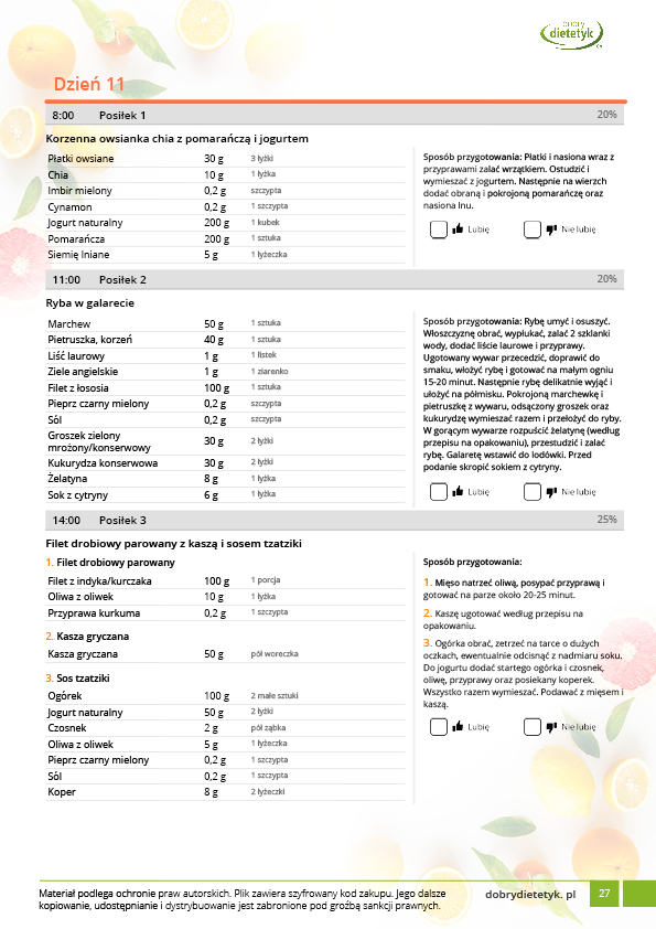 w formie precyzyjnych jadłospisów wielodniowych (na każdy dzień miesiąca jest opracowany osobny jadłospis). Tutaj nie musisz zastanawiać się co zjeść każdego dnia, gdyż będziesz mieć dokładnie wszystko rozplanowane.