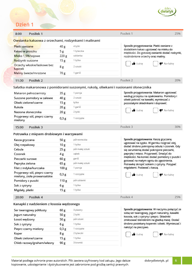 w formie precyzyjnych jadłospisów wielodniowych (na każdy dzień miesiąca jest opracowany osobny jadłospis). Tutaj nie musisz zastanawiać się co zjeść każdego dnia, gdyż będziesz mieć dokładnie wszystko rozplanowane.
