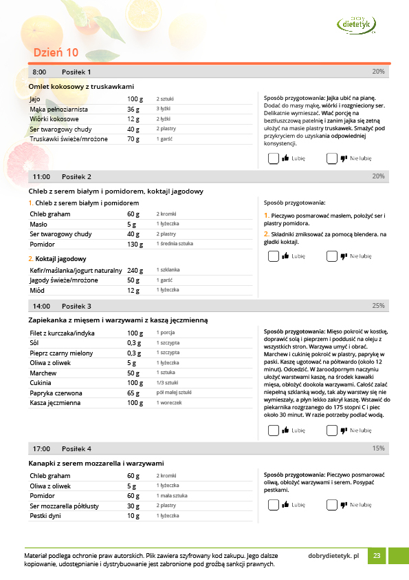 • w formie precyzyjnych jadłospisów wielodniowych (na każdy dzień miesiąca jest opracowany osobny jadłospis). Tutaj nie musisz zastanawiać się co zjeść każdego dnia, gdyż będziesz mieć dokładnie wszystko rozplanowane.
