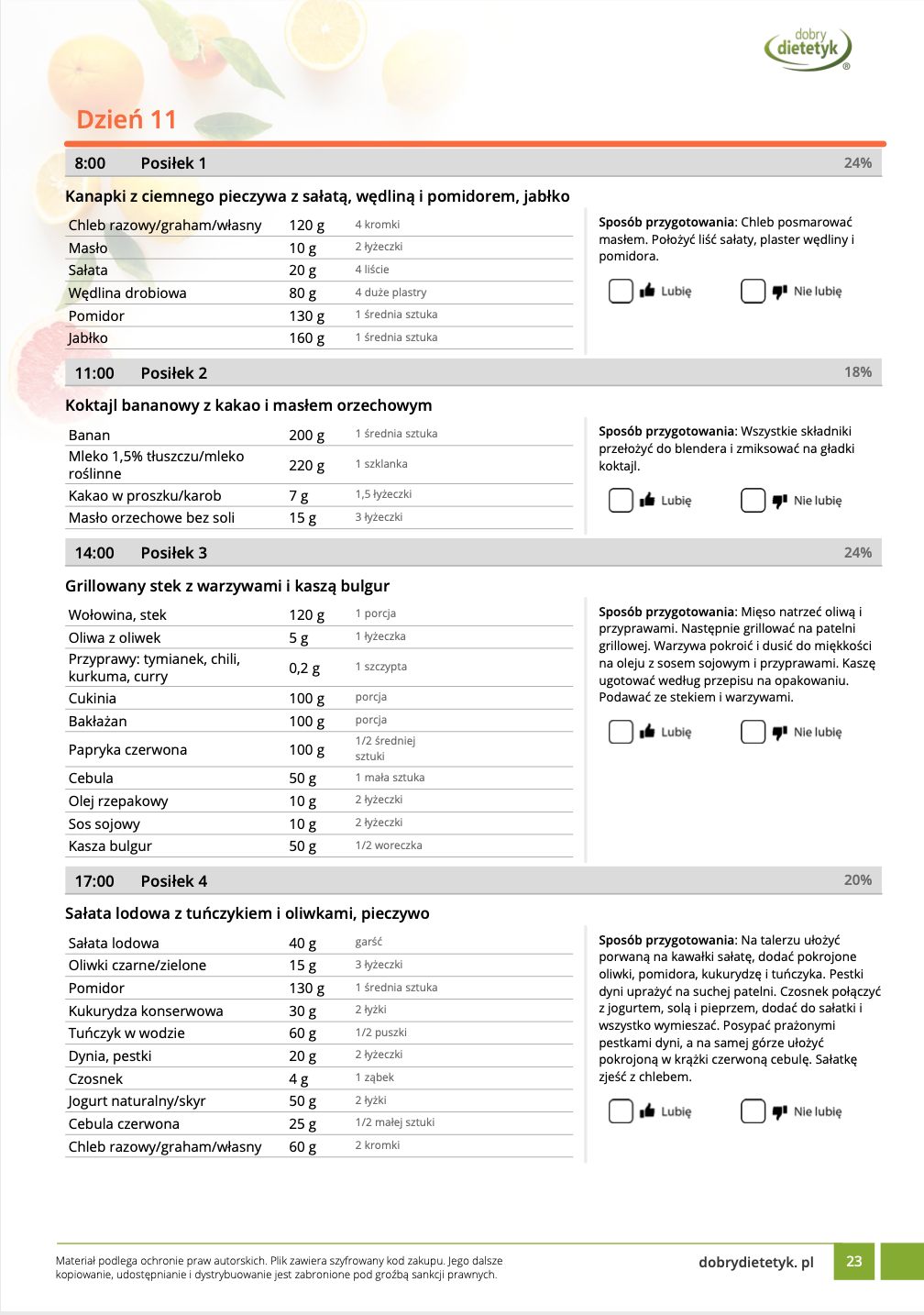 • w formie precyzyjnych jadłospisów wielodniowych (na każdy dzień miesiąca jest opracowany osobny jadłospis). Tutaj nie musisz zastanawiać się co zjeść każdego dnia, gdyż będziesz mieć dokładnie wszystko rozplanowane.