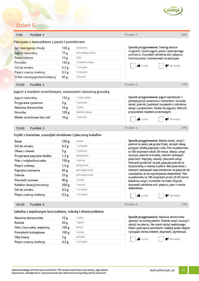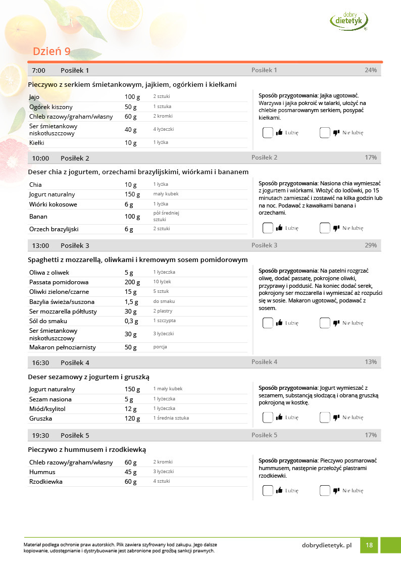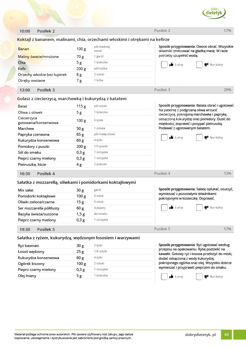 w formie propozycji posiłków (zamiast pojedynczych jadłospisów jednodniowych, przygotowano propozycje kilku propozycji dań na każdy posiłek). Tutaj nie uzależniamy Cię od tego jakie masz np. w danym dniu zjeść śniadanie czy obiad, tylko sam wybierasz sobie ulubione danie z kilku przedstawionych przez nas propozycji.