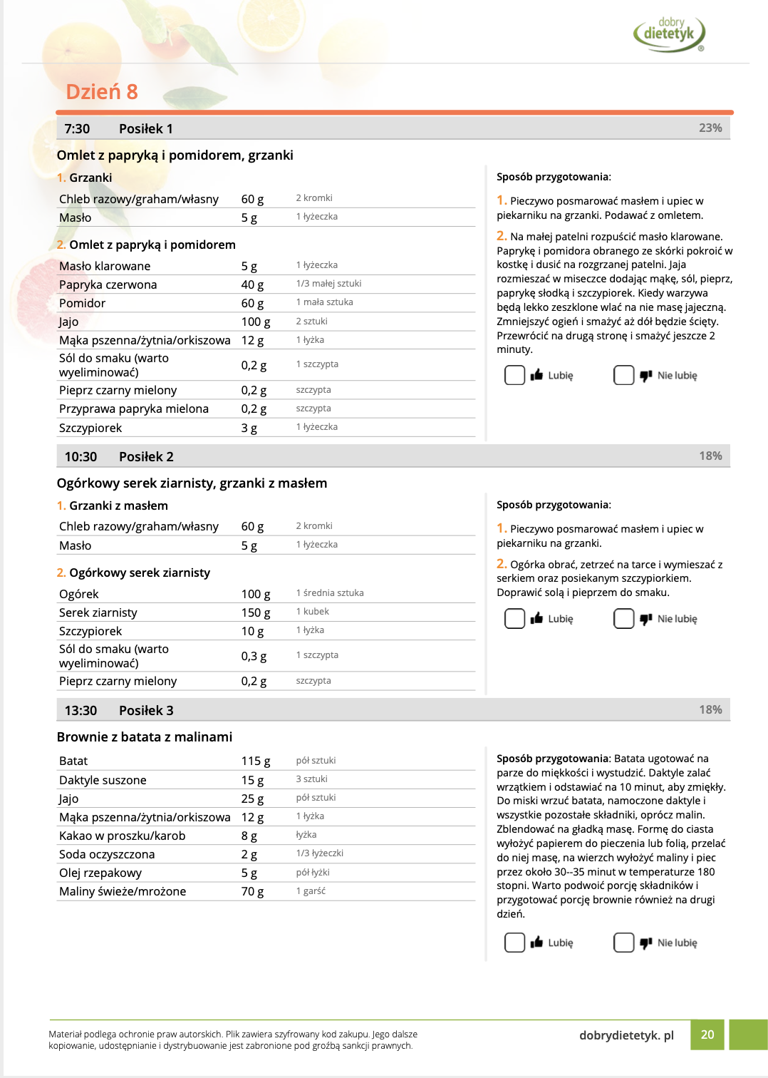 • w formie precyzyjnych jadłospisów wielodniowych (na każdy dzień miesiąca jest opracowany osobny jadłospis). Tutaj nie musisz zastanawiać się co zjeść każdego dnia, gdyż będziesz mieć dokładnie wszystko rozplanowane.